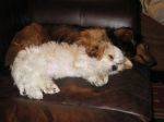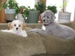 Here's my little baby, Izzy. She's a Cavalier King Charles Spaniel and Bichon Frise mix. In the 1st picture she is hanging out with her Doxie cousin/playmate extraordinaire Walter and in the 2nd she is with her Poodle cousin Belle.